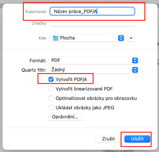 4. Zaškrtněte možnost Vytvořit v PDF/A